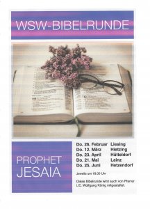 Wir laden ein zu dem Bibelzyklus "Bibel im Gespräch" von Pfr. Dr. Lubomir Batka (PG Liesing), der abwechselnd in den fünf WSW-Gemeinden jeweils an Donnerstagen von 18.00 - 20 Uhr gehalten wird..